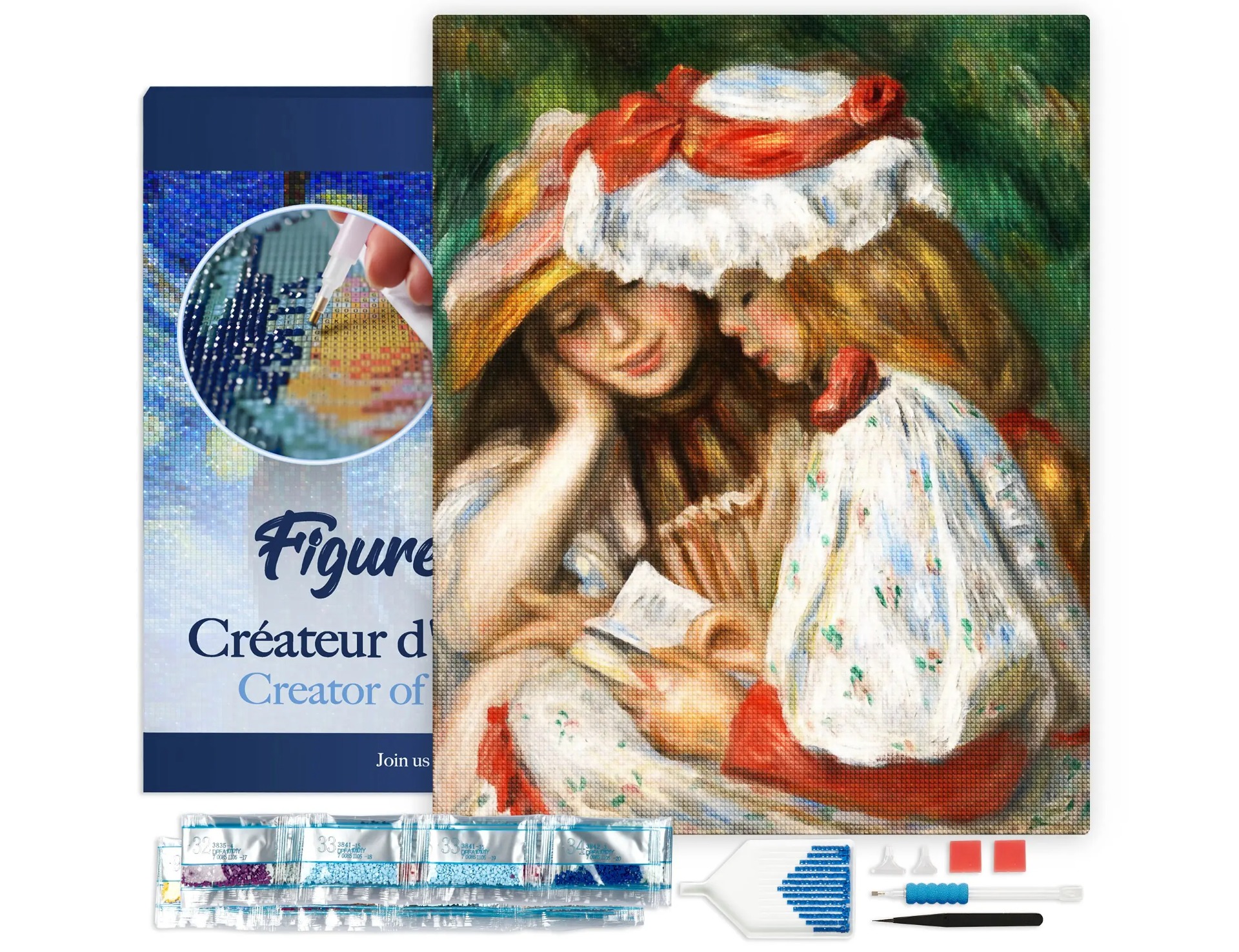 Tämä timanttimaalaussetti (40x50cm) puukehykseen kiinnitettynä sisältää kaiken tarvittavan: korkealaatuinen liimakangas, numeroitu valmistettavan kuvion mukaan. Kankaan takana oleva puulevy takaa täydellisen jäykkyyden timanttien kiinnittämiseen. Yksittäin numeroidut timanttipussit (+ 30 % enemmän timantteja maalauksen personointiin halutessasi), 1 kynä + 2 lisätimanttipäätä (6 ja 9 timanttia), * 1 pinsetit, 1 alusta ja 1 vahalevy.