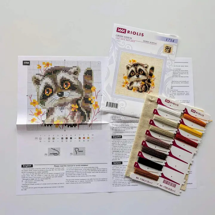 Laadukkaissa RIOLIS-ristipistopakkauksissa on kaikki tarvikkeet mukana. Pakkaus sisältää: Ensiluokkainen 14 karaatin pellavainen Zweigart Aida -kangas, hienosti lajiteltuja villa-/akryylilankoja (10 väriä), korkealaatuinen neula sekä helppokäyttöinen värikartta.