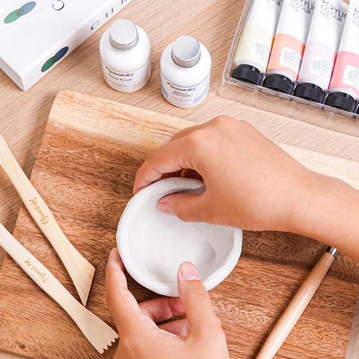 Keramiikan teko on niin ihanaa! Mutta aina ei ole mahdollisuutta päästä polttamaan ja lasittamaan savituotteita. Tässä setissä on kaikki mitä tarvitset kotona tehtävään savityöskentelyyn. Et tarvitse uunia keramiikan polttoon, vaan tämä savi kuivuu huoneilmassa. Mukana on 2kg savea, työkalut muotoiluun, maalit ja lakat, sivellin ja sieni sekä säilytyspussukka.